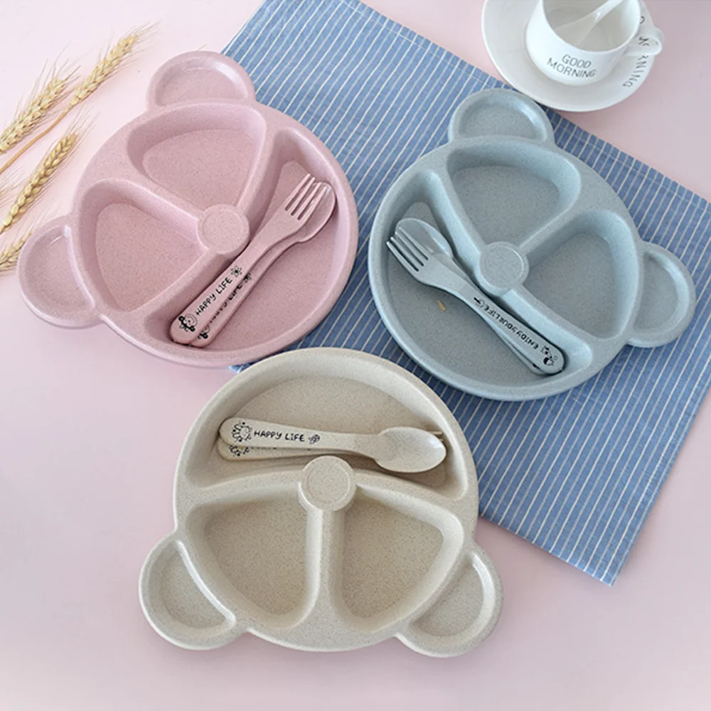 3Pcs Wheat straw children compartment dinner plate kindergarten students bear tableware set children tableware lunch box