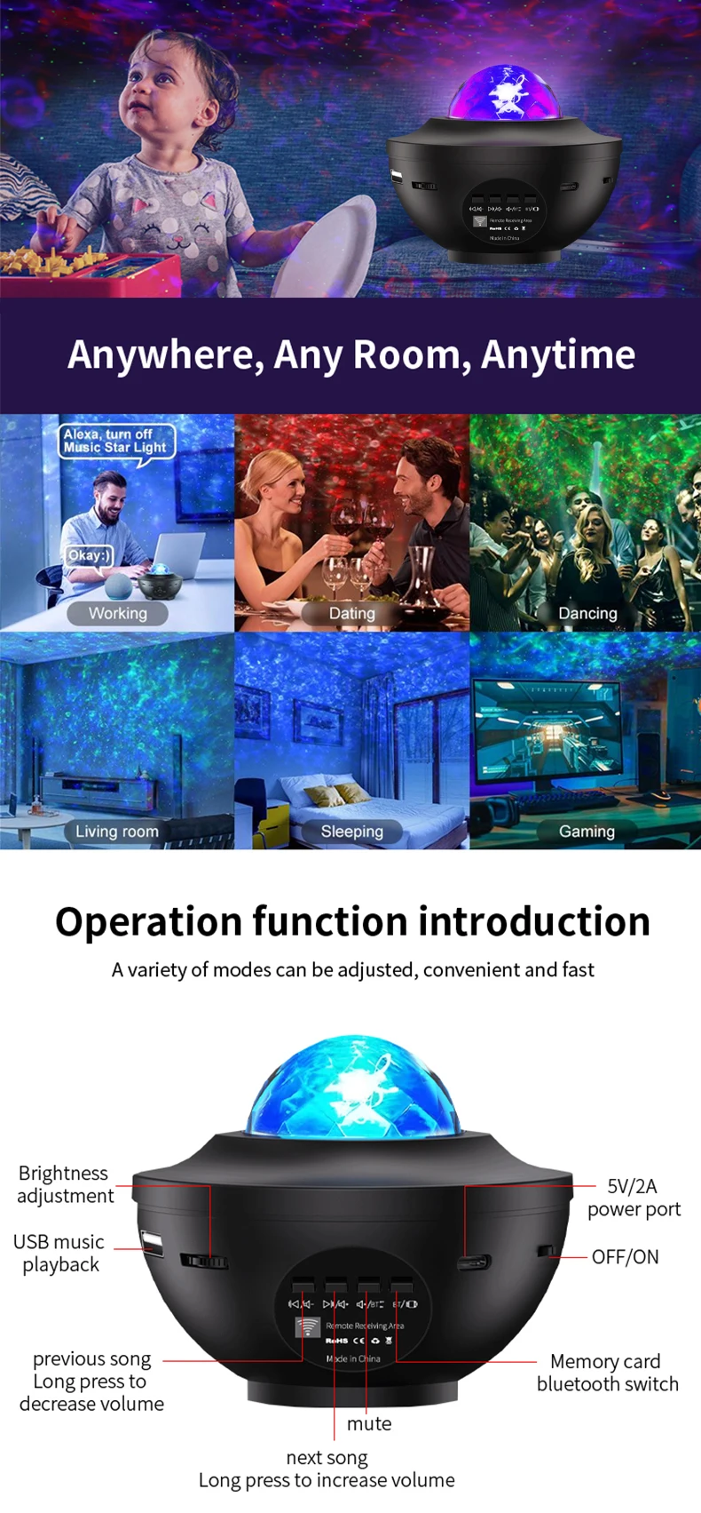 LED Starry Sky Projector Night Light Remote Control Switch USB Music Player Ocean Wave Galaxy Ambient Light Kids Birthday Gift