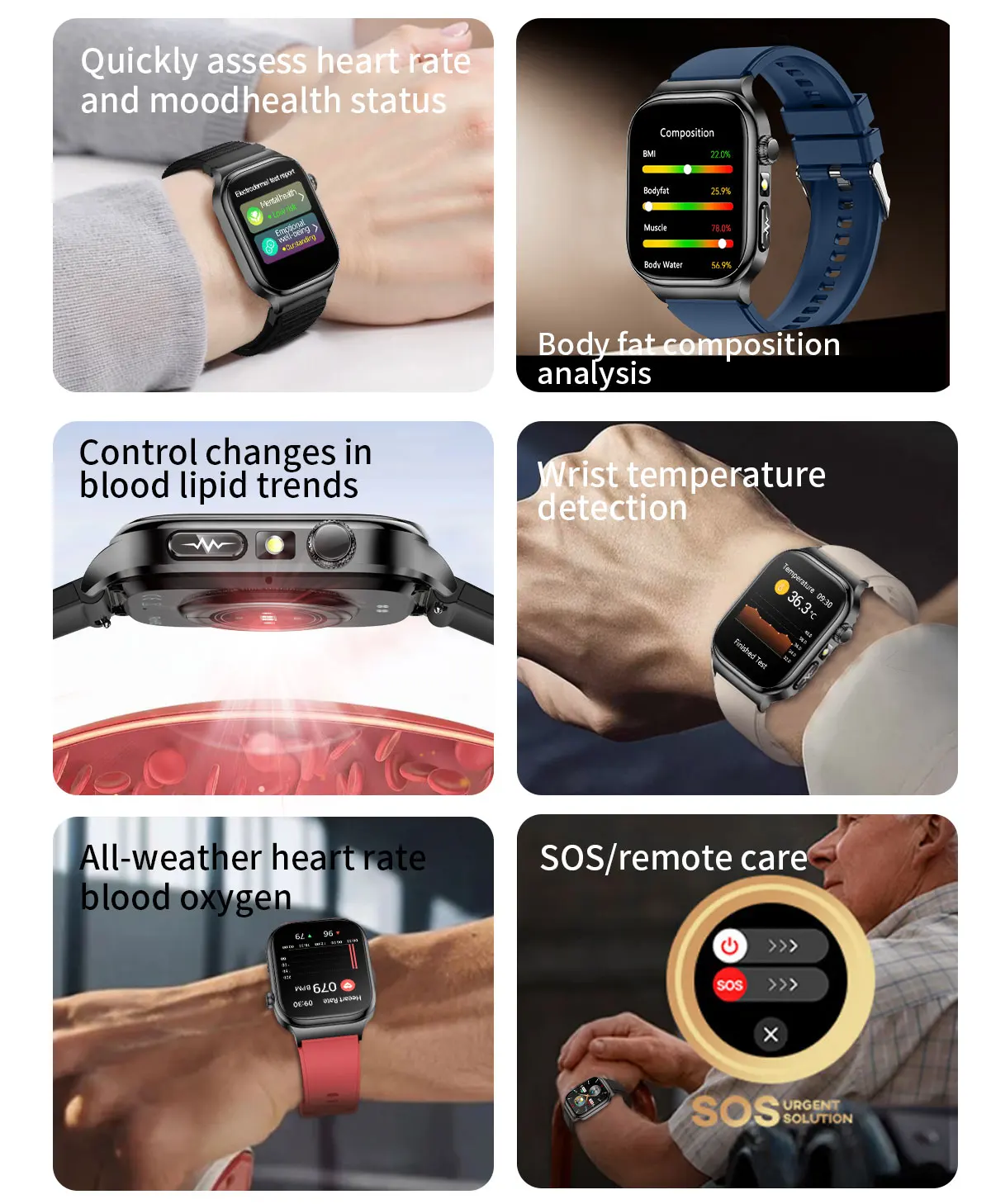 Uric acid, blood lipids, body temperature: heart rate, blood oxygen, blood pressure, sleep, stress testing